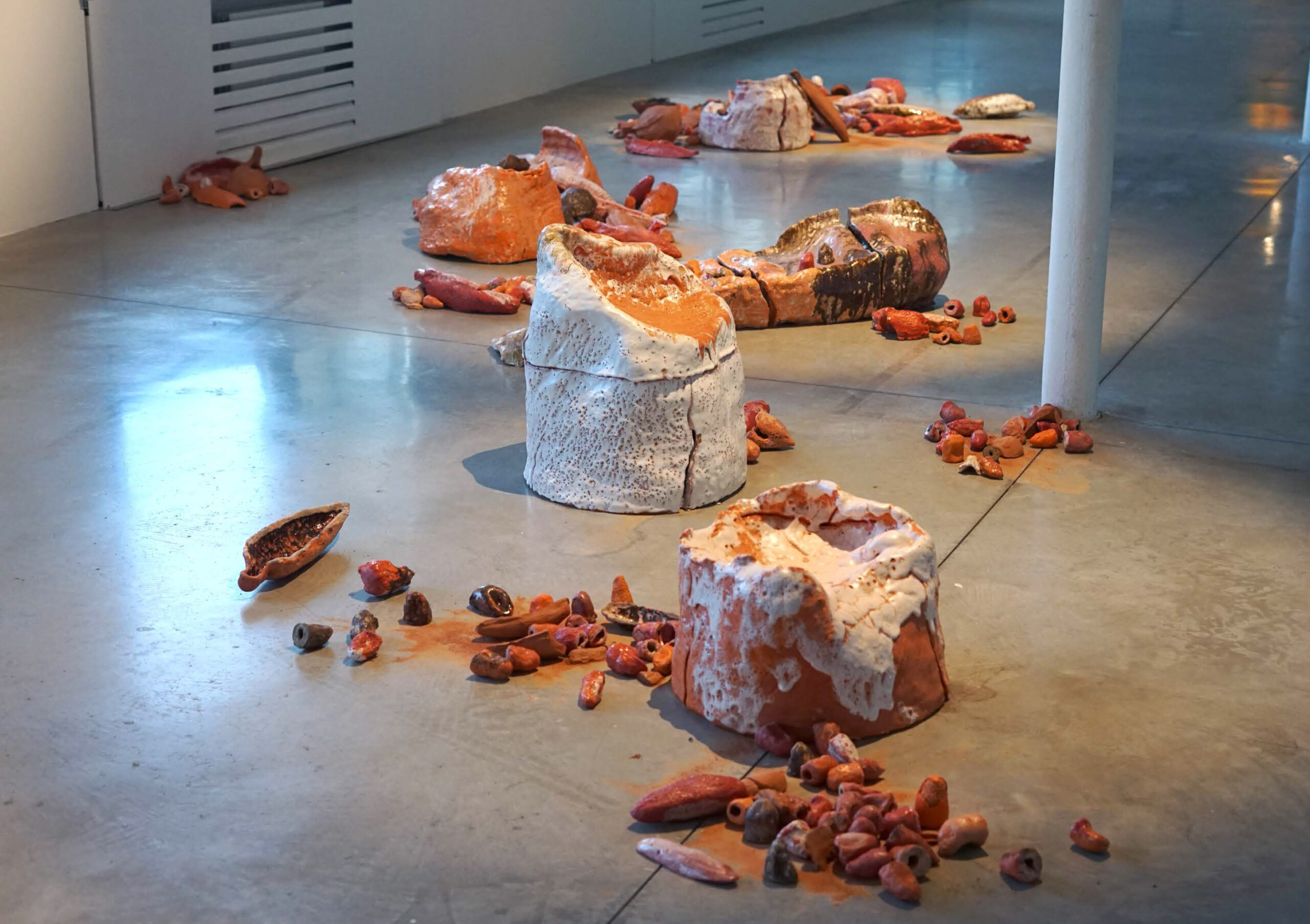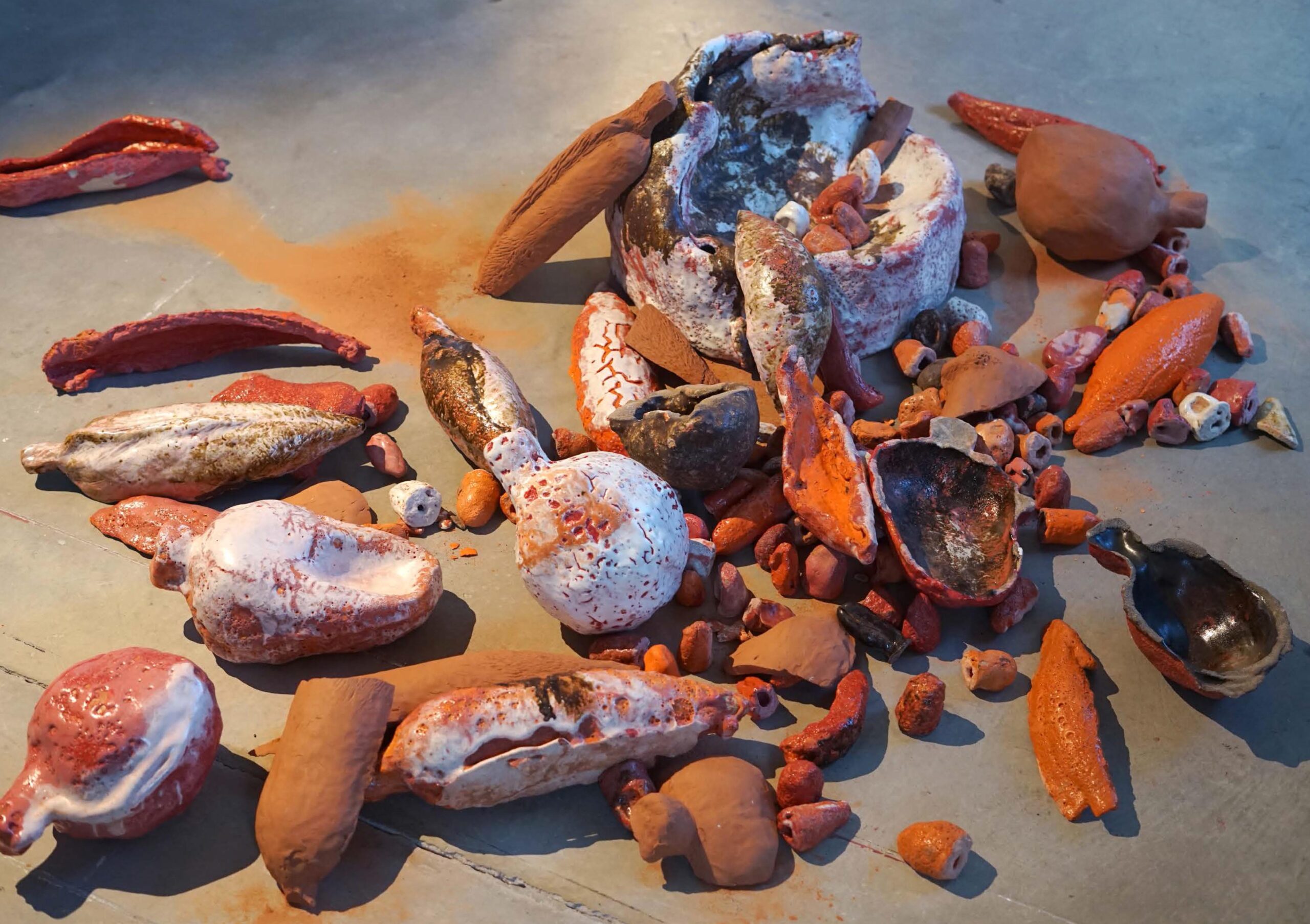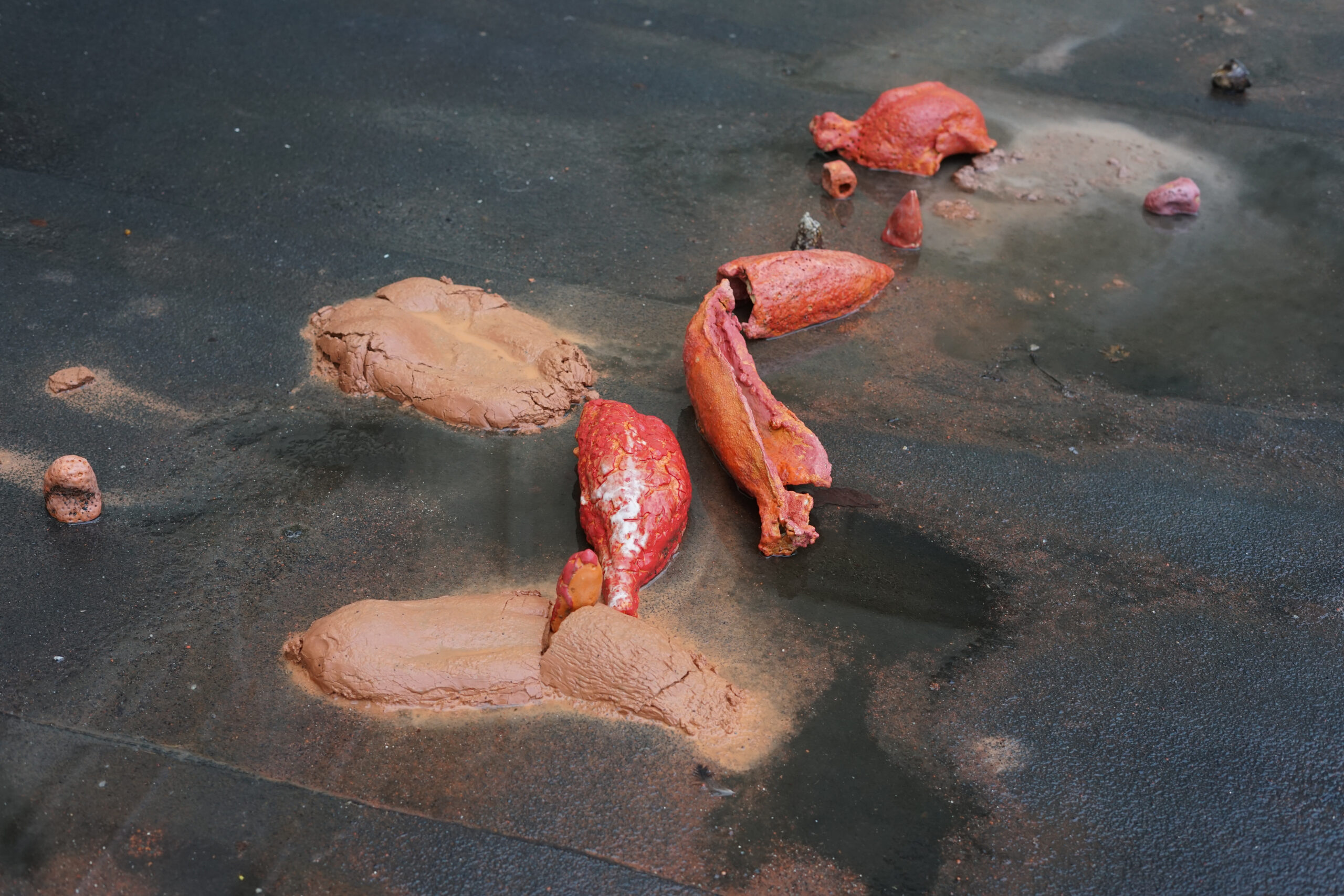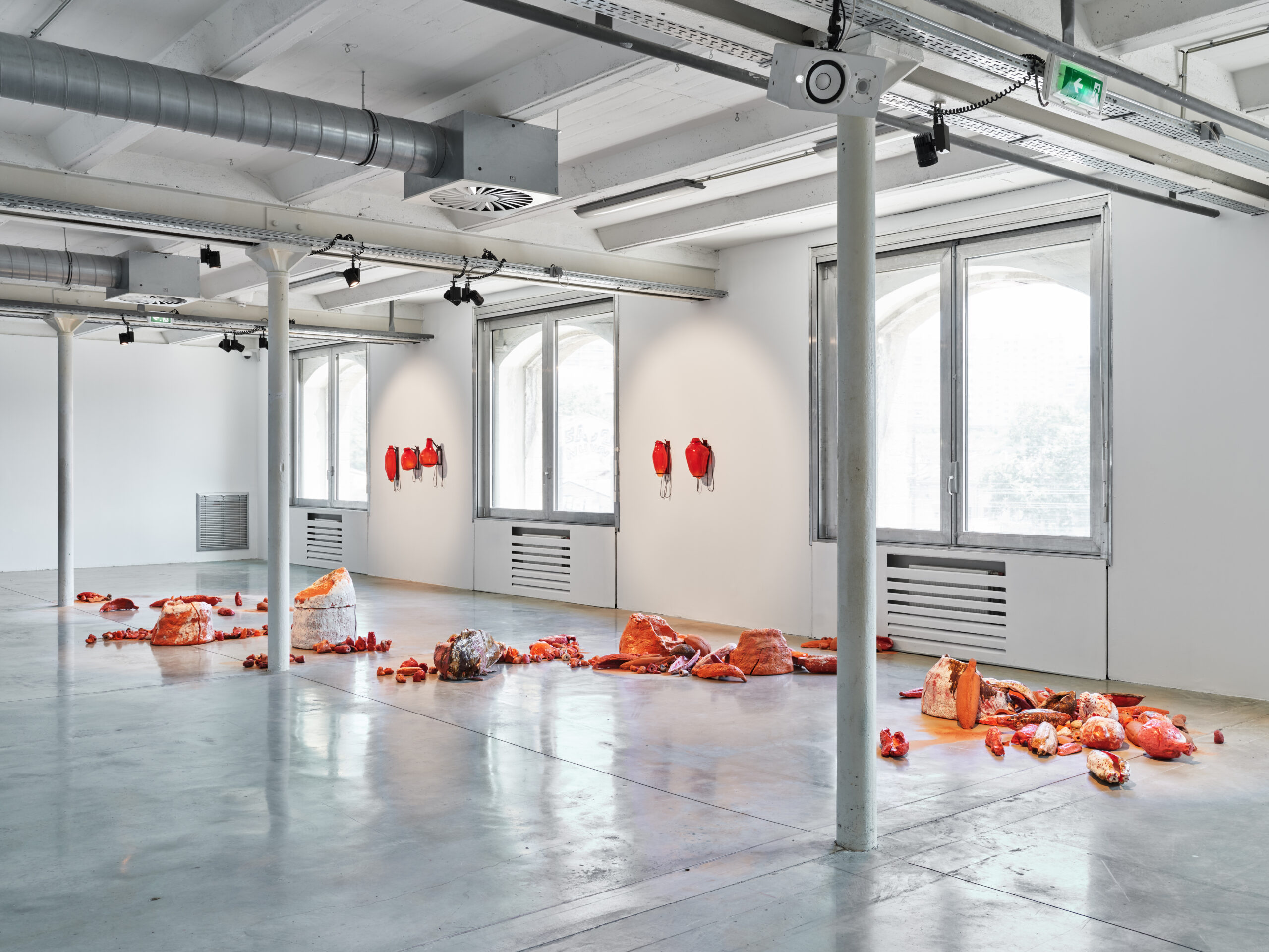 Cette installation aborde la privatisation des semences hybrides stériles, symbolisant le conflit entre la dépendance industrielle et la préservation des semences paysannes. Elle représente de manière surdimensionnée les semences les plus utilisées en Europe, réalisées en verre soufflé et en céramique. L’œuvre évoque l’urgence et la fragilité, le rouge vif rappelle les revêtements toxiques. Les semences en verre soufflé sont portées comme des sacs à dos. Celles en céramique, parfois non cuites, se désintègrent sous l’effet de la pluie et du temps, se transformant en boue prête à être réutilisée pour un renouveau.